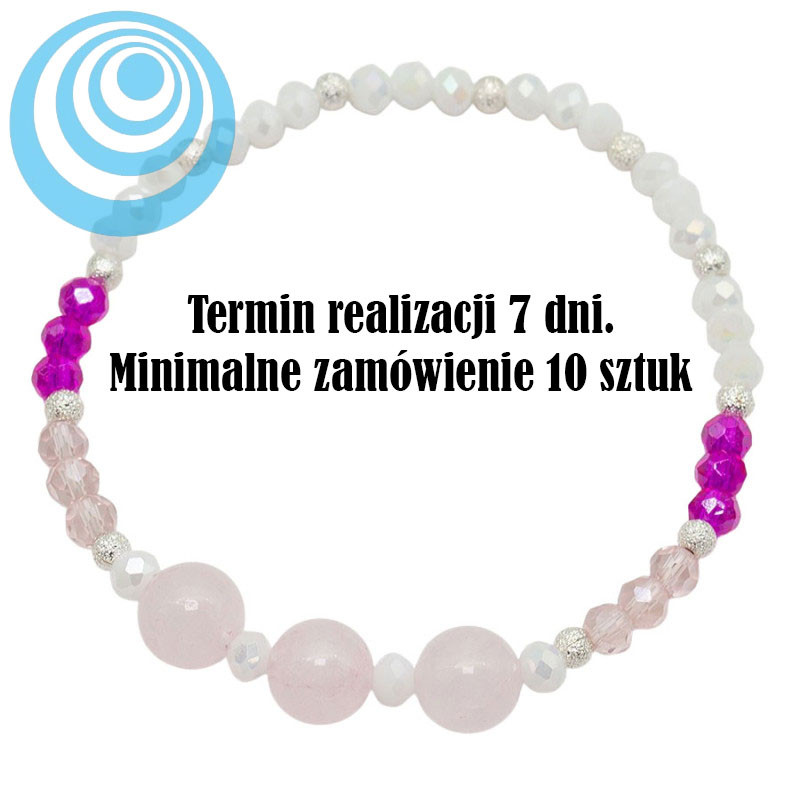 Ta bransoletka przyciąga wzrok delikatnym połączeniem jasnych, mlecznych koralików z akcentami intensywnego różu. Większe, gładkie kule w pudrowym odcieniu stanowią centralny punkt kompozycji, a drobniejsze, fasetowane elementy odbijają światło i dodają całości lekkości. Kontrastujące wstawki w wyrazistym, malinowym kolorze przełamują pastelową bazę i wprowadzają energię. Srebrzyste przekładki subtelnie rozdzielają segmenty, porządkując formę i podkreślając rytm całego projektu.