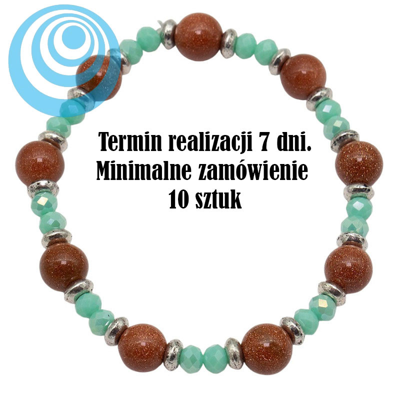 Bransoletka zestawia ciepły, brązowy odcień większych kul z chłodną, miętową tonacją drobniejszych, fasetowanych koralików. Gładkie, większe elementy mają subtelnie migoczącą strukturę, która tworzy efekt rozproszonego blasku. Między nimi pojawiają się mniejsze koraliki o wyraźnych szlifach, odbijające światło i dodające lekkości całej kompozycji. Srebrzyste przekładki wprowadzają rytm i podkreślają kontrast kolorystyczny, nadając bransoletce uporządkowany, wyrazisty charakter.