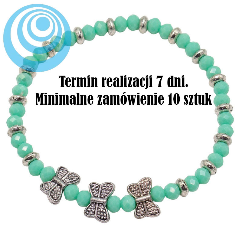 Bransoletka przyciąga świeżą, miętową barwą drobnych, fasetowanych koralików. Ich szlifowana powierzchnia delikatnie odbija światło i nadaje całości subtelny blask. Rytm kompozycji podkreślają srebrzyste przekładki, które wprowadzają wyraźne akcenty pomiędzy koralikami. Centralnym punktem są trzy ozdobne motyle w srebrnym kolorze. Ich ażurowa faktura i dekoracyjne detale nadają bransoletce romantycznego, lekkiego charakteru.