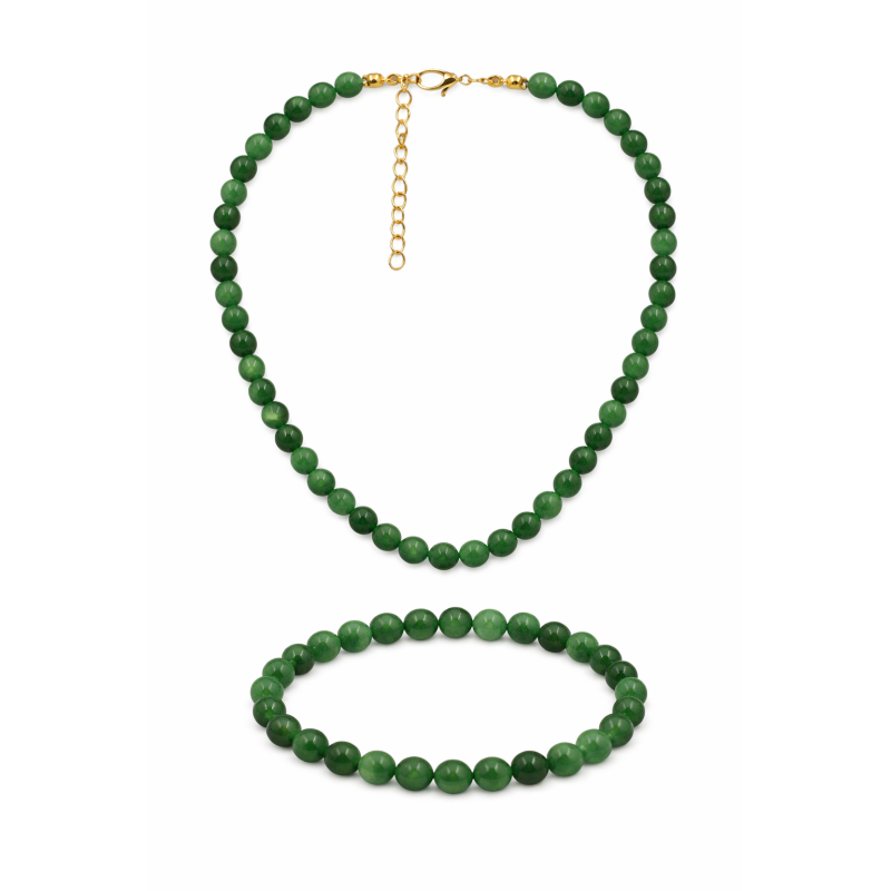 Elegancki komplet składający się z naszyjnika oraz bransoletki wykonanych z naturalnego zielonego awenturynu. Głęboki, nasycony odcień zieleni nadaje biżuterii świeżości i klasy, pięknie komponując się zarówno z jasnymi, jak i ciemniejszymi stylizacjami.