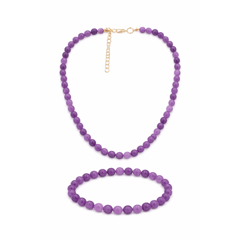 Subtelny komplet składający się z naszyjnika oraz bransoletki wykonanych z naturalnego ametystu lawendowego. Delikatny, jasnofioletowy odcień kamieni nadaje biżuterii elegancji i romantycznego charakteru, idealnie dopełniając zarówno codzienne, jak i bardziej wyrafinowane stylizacje.