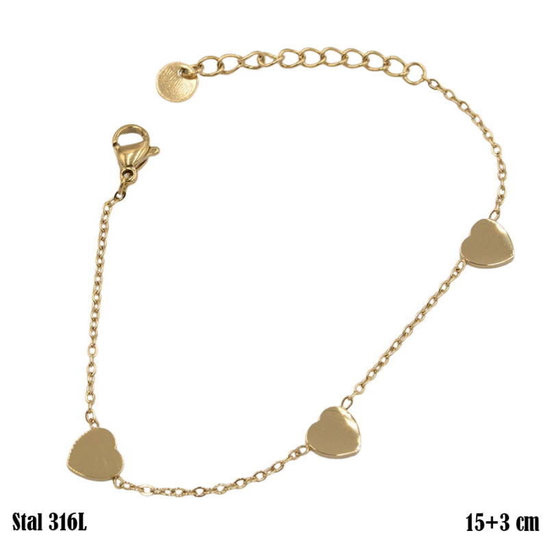 Pozłacana bransoletka z trzema zawieszkami w kształcie serca tworzy subtelną, romantyczną kompozycję. Cienki łańcuszek o delikatnym splocie nadaje całości lekkości, a gładkie, lśniące serca odbijają światło i przyciągają wzrok przy każdym ruchu dłoni. Prosta forma sprawia, że model prezentuje się elegancko i nie dominuje stylizacji. Długość 15 cm z przedłużką 3 cm umożliwia wygodne dopasowanie do nadgarstka.