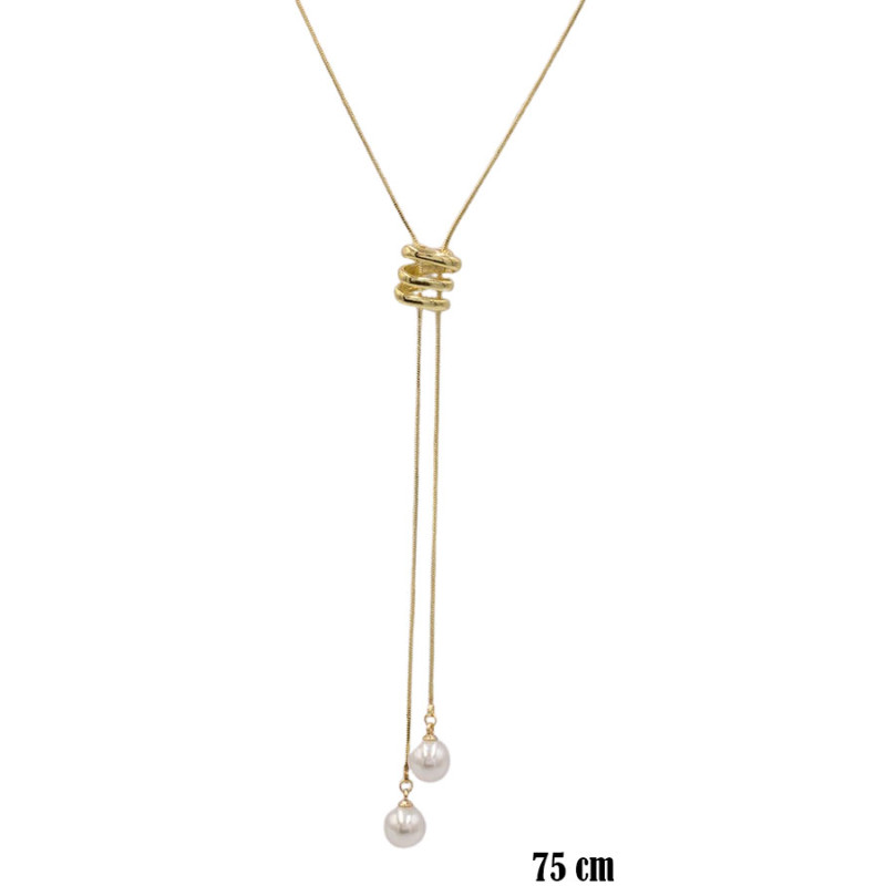 Smukły naszyjnik w kolorze złota przyciąga uwagę wydłużoną formą i dekoracyjnym detalem w centralnej części. Górę zdobią trzy nieregularne, owalne elementy ułożone jeden nad drugim, które nadają kompozycji nowoczesny charakter. Z nich swobodnie opadają dwa cienkie łańcuszki zakończone jasnymi, perłowymi kulami. Całość tworzy lekki, pionowy akcent, który optycznie wysmukla sylwetkę. Długość 75 cm oraz regulacja pozwalają dopasować model do różnych dekoltów.