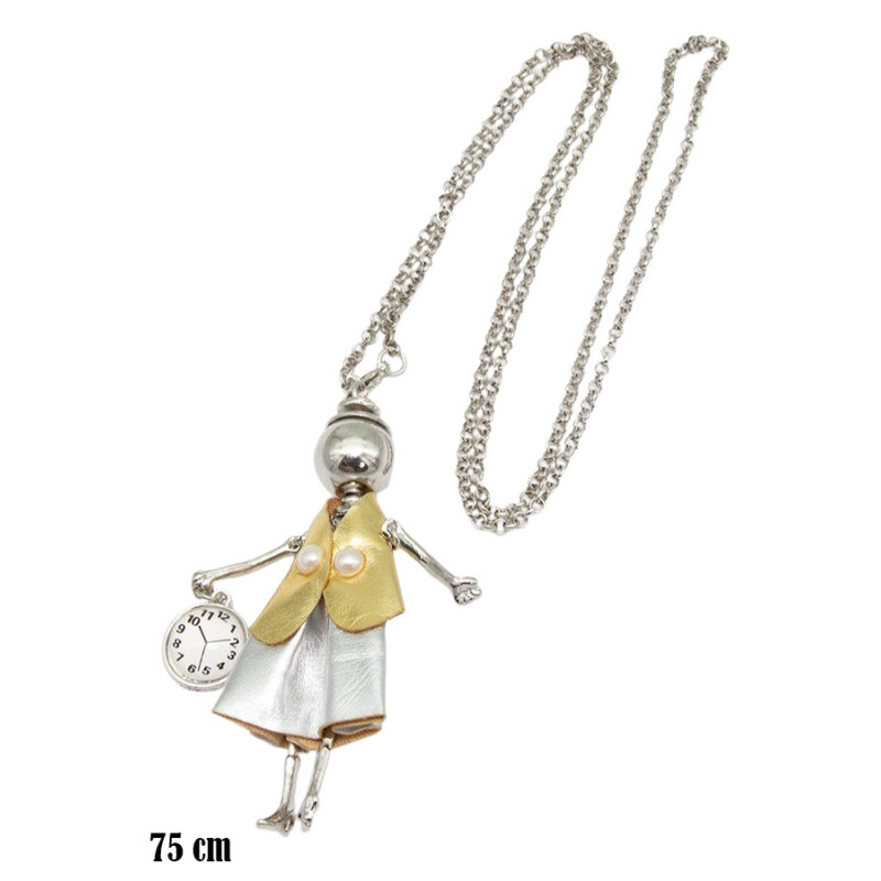 Ten naszyjnik o długości 75 cm łączy dekoracyjną formę z wyrazistą kolorystyką. Smukły łańcuszek w srebrnym odcieniu prowadzi do zawieszki w kształcie kobiecej postaci. Góra stylizacji utrzymana jest w złotym kolorze, dół w srebrnym, co tworzy kontrastowy, ale spójny efekt. Sukienka ma wyraźną, lekko połyskującą fakturę, a drobne detale – torebka z motywem zegara, subtelne ręce i nogi – nadają całości lekkości i charakteru.