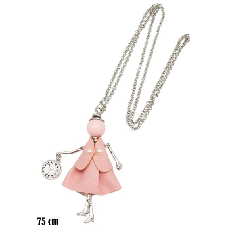 Długi naszyjnik o długości 75 cm przyciąga uwagę delikatnym, różowym akcentem. Smukły łańcuszek w srebrnym kolorze prowadzi do zawieszki w formie kobiecej postaci. Sukienka w odcieniu pudrowego różu ma wyraźną, lekko ziarnistą fakturę, która nadaje jej głębi. Gładka, okrągła główka oraz metaliczne detale – ręce, nogi i torebka z motywem zegara – tworzą spójną, dekoracyjną całość. Drobne elementy na górze stylizacji podkreślają staranne wykończenie formy.