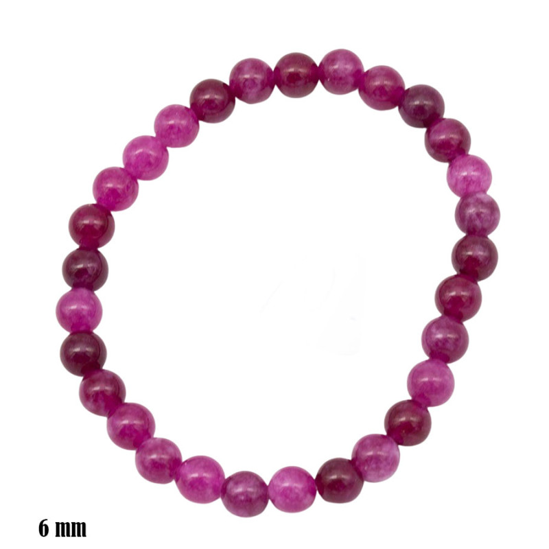 Bransoletka z okrągłych kamieni o średnicy 6 mm przyciąga mocnym, nasyconym kolorem fuksji. Odcienie przechodzą od jaśniejszych, świetlistych tonów po głębsze, bardziej malinowe akcenty, co nadaje całości dynamiczny charakter. Gładkie, lekko połyskujące kulki tworzą regularny okrąg i estetycznie układają się na nadgarstku. Subtelne różnice w barwie sprawiają, że bransoletka nie jest jednolita, a jej kolor zyskuje głębię i wyrazistość.
