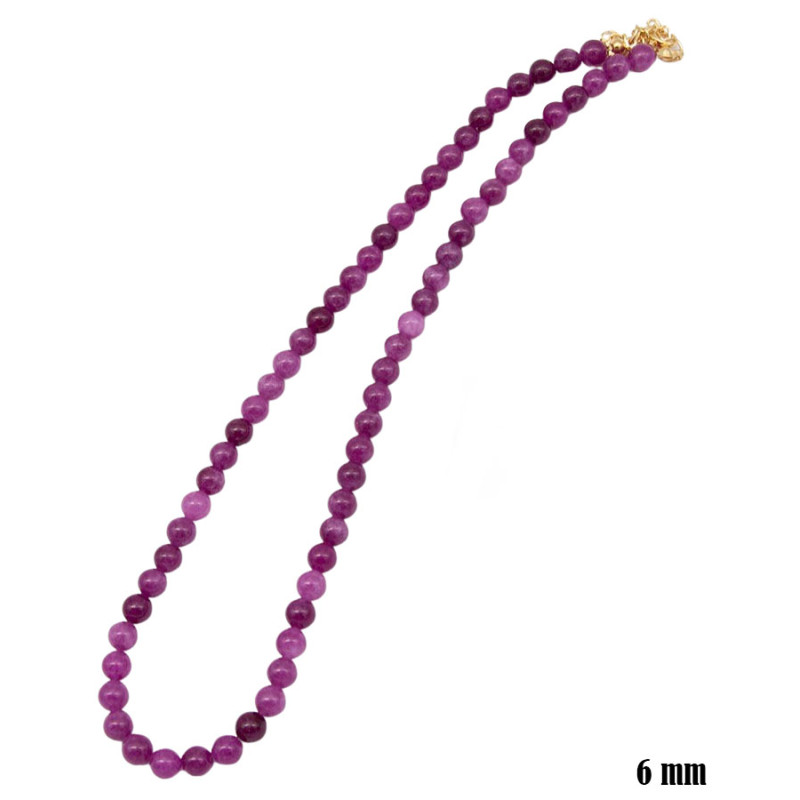 naszyjnik z okrągłych kamieni o średnicy 6 mm przyciąga intensywną, nasyconą barwą fuksji. Odcienie przechodzą od jaśniejszych, świetlistych tonów po głębokie, malinowe akcenty, tworząc dynamiczną, ale spójną kompozycję. Gładkie, lekko połyskujące kulki układają się w równą, smukłą linię, która estetycznie podkreśla szyję. Całość wykończona jest zapięciem w kolorze złotym z przedłużką, co pozwala dopasować długość do różnych fasonów dekoltu.