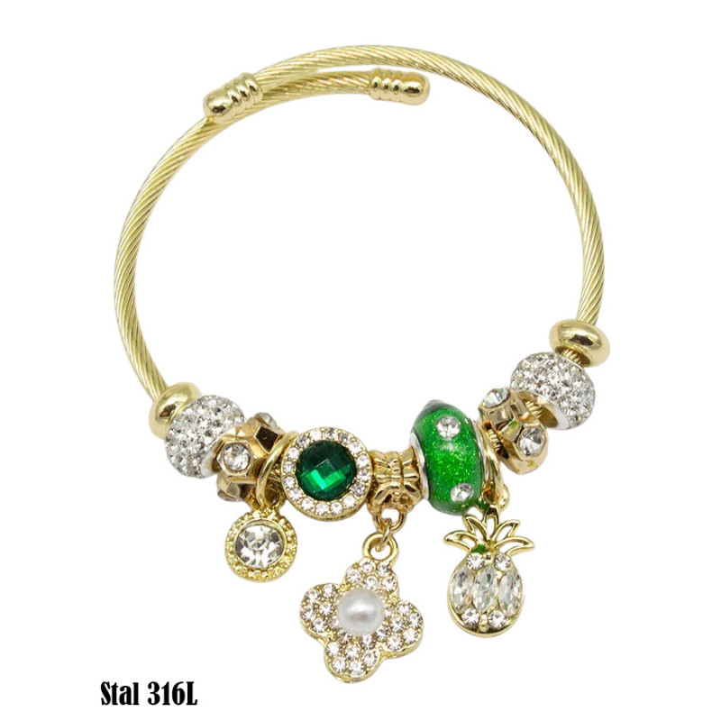 Sztywna bransoletka w kolorze złotym łączy dekoracyjną formę z wyrazistym, zielonym detalem. Skręcana obręcz tworzy solidną bazę dla ozdobnych elementów. W centralnej części znajduje się okrągły moduł z zielonym kamieniem otoczonym drobnymi kryształkami oraz koralik w intensywnym, brokatowym odcieniu zieleni. Kompozycję uzupełniają przekładki wysadzane kryształkami oraz zawieszki: okrągła z jasnym kamieniem, koniczyna z perłowym środkiem i ananas zdobiony jasnymi kryształkami. Całość prezentuje się efektownie i spójnie.