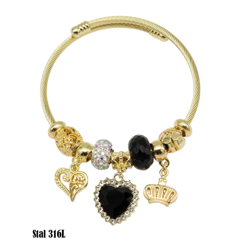 Sztywna bransoletka w kolorze złotym łączy elegancką formę z kontrastowym, czarnym akcentem. Skręcana obręcz stanowi stabilną bazę dla ozdobnych modułów. W centralnej części znajduje się duże, czarne serce o gładkiej, połyskującej powierzchni, otoczone drobnymi kryształkami. Kompozycję uzupełniają fasetowany koralik w głębokim odcieniu czerni, element z wielobarwnymi drobnymi kryształkami oraz zawieszki: ażurowe serce i korona. Całość tworzy wyrazistą, dekoracyjną kompozycję w złoto-czarnej tonacji.