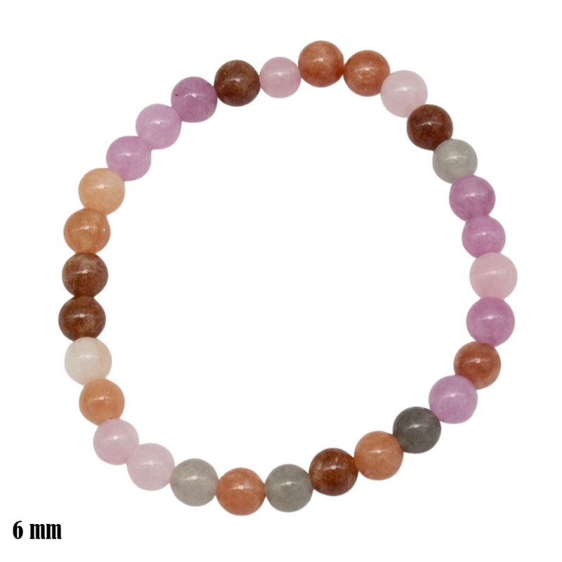 Bransoletka z okrągłych kamieni o średnicy 6 mm łączy różnorodne odcienie w jednej, spójnej kompozycji. Wśród kulek pojawiają się delikatne róże, ciepłe brązy, beże oraz subtelne, szarawe tony. Zestawienie jasnych i bardziej nasyconych barw tworzy naturalny, lekko ziemisty charakter. Gładka, lekko połyskująca powierzchnia kamieni podkreśla ich kolorystykę, a regularny układ nadaje całości estetyczną, uporządkowaną formę.
