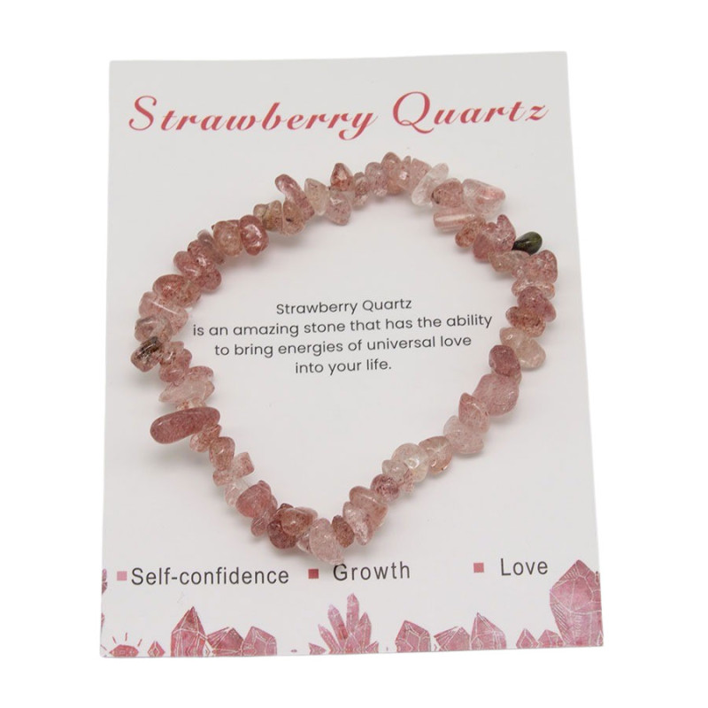 Bransoletka z drobnych, nieregularnych kamieni w odcieniu pudrowego różu z subtelnymi, ciemniejszymi inkluzjami tworzy lekką i naturalną kompozycję. Kamienie mają półprzezroczystą strukturę, a ich powierzchnia delikatnie odbija światło, podkreślając różnorodność tonów – od jasnych, niemal mlecznych fragmentów po bardziej nasycone, truskawkowe akcenty. Nieregularne kształty nadają modelowi swobodny charakter i sprawiają, że każda bransoletka prezentuje się nieco inaczej.