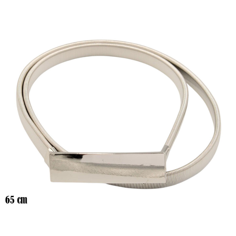 Elastyczny Pasek o długości 65 cm przyciąga wzrok wyraźną, prostokątną klamrą o gładkiej, lustrzanej powierzchni. Srebrny kolor nadaje mu chłodny, elegancki charakter. Sprężynkowa struktura tworzy zwartą, równą linię, która estetycznie układa się wokół talii. Całość prezentuje się nowocześnie i uporządkowanie, bez zbędnych zdobień. Metaliczny połysk podkreśla minimalistyczną formę i sprawia, że pasek staje się wyrazistym elementem stylizacji.