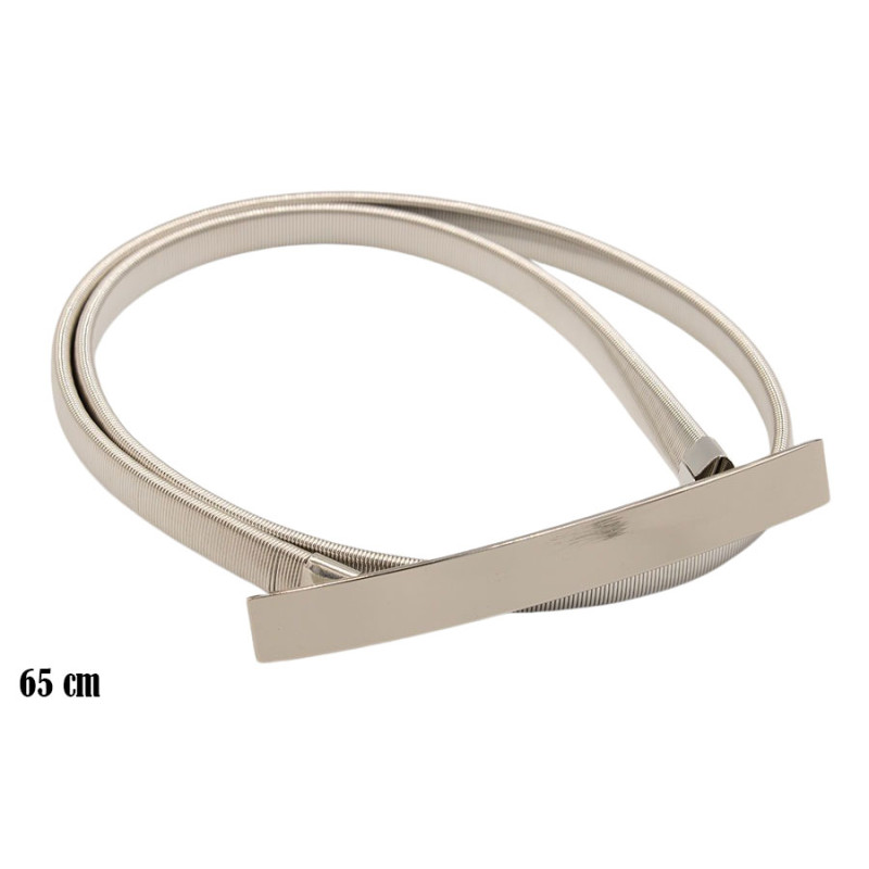 Elastyczny Pasek o długości 65 cm prezentuje nowoczesną, lekką linię. Sprężynkowa konstrukcja w srebrnym kolorze tworzy równą, subtelną strukturę, która estetycznie oplata talię. Centralnym punktem jest podłużna, gładka blaszka o prostym, geometrycznym kształcie. Jej połyskująca powierzchnia odbija światło i nadaje całości elegancki, uporządkowany wygląd. Minimalistyczna forma sprawia, że pasek nie dominuje stylizacji, lecz ją podkreśla.