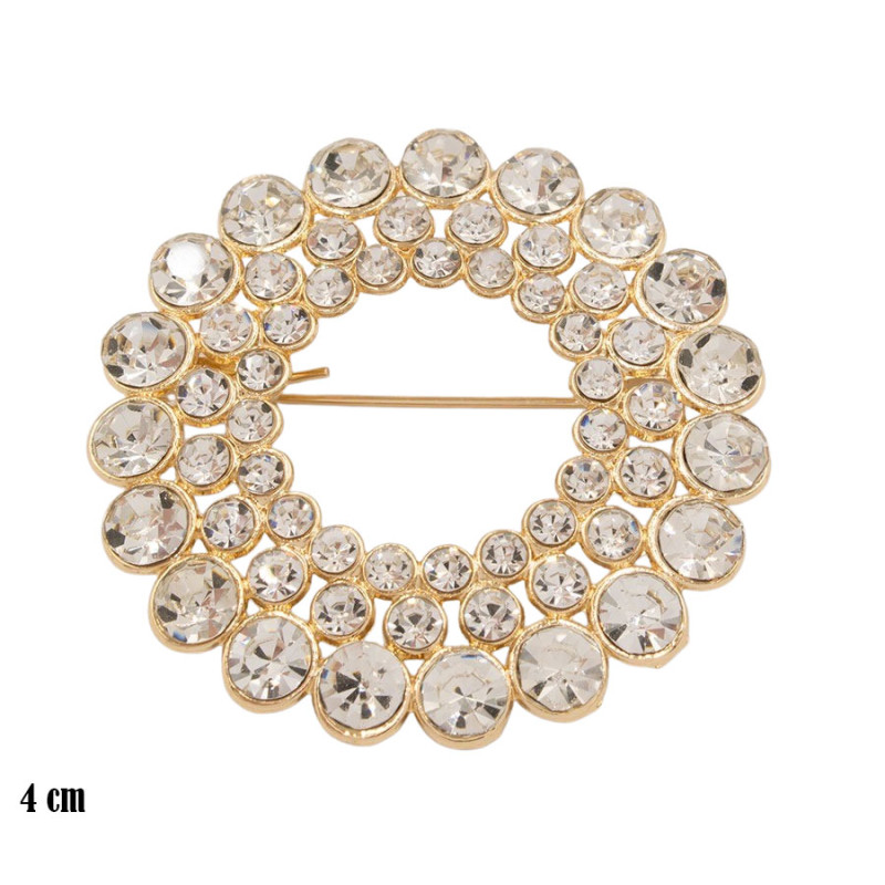 Broszka o średnicy 4 cm zachwyca wyrazistą, okrągłą formą w złotym kolorze. Całą powierzchnię wypełniają przezroczyste kamienie o różnej wielkości, osadzone gęsto obok siebie. Większe oczka tworzą zewnętrzny kontur, a mniejsze subtelnie wypełniają środek, budując efekt głębi i intensywnego połysku. Złota oprawa podkreśla jasny blask kamieni i nadaje całości elegancki, biżuteryjny charakter.