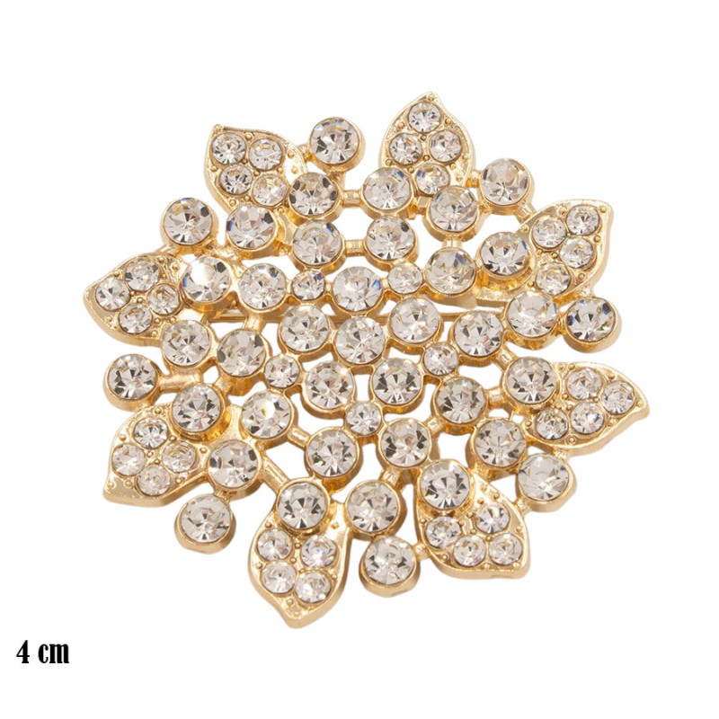 Broszka o średnicy 4 cm przyciąga uwagę dekoracyjną formą inspirowaną kształtem gwiazdy lub rozety. Złota baza została gęsto wypełniona przezroczystymi kamieniami o różnej wielkości, które tworzą efekt wielowymiarowego połysku. Zewnętrzne ramiona wykończono drobniejszymi oczkami, a centralna część zbudowana jest z większych elementów, dzięki czemu całość zyskuje wyraźną strukturę i dynamiczny charakter.