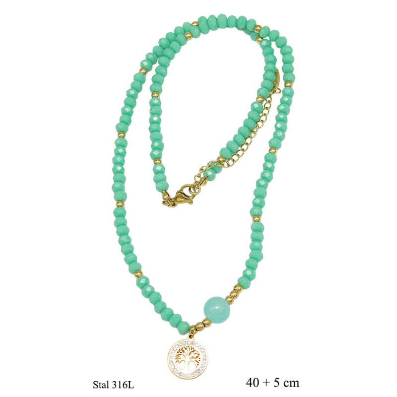 naszyjnik przyciąga wzrok intensywnym, turkusowym kolorem fasetowanych koralików, które pięknie odbijają światło. Regularna forma drobnych elementów została przełamana większą, gładką kulą w centralnej części oraz okrągłą zawieszką z motywem drzewa. Złote przekładki i łańcuszek przedłużający nadają całości elegancki kontrast. Długość 40 + 5 cm pozwala dopasować biżuterię do dekoltu i stylizacji.