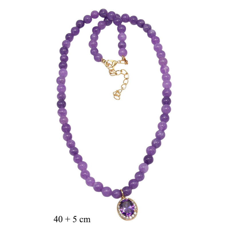 Ten naszyjnik buduje styl kolorem. Okrągłe, gładkie koraliki w odcieniach fioletu tworzą spójną linię wokół szyi, a centralna zawieszka z dużym, fioletowym kamieniem przyciąga spojrzenia i skupia światło. Złota oprawa oraz delikatne zdobienia wokół kamienia dodają całości eleganckiego kontrastu. Długość 40 + 5 cm pozwala swobodnie regulować ułożenie naszyjnika przy dekolcie.
