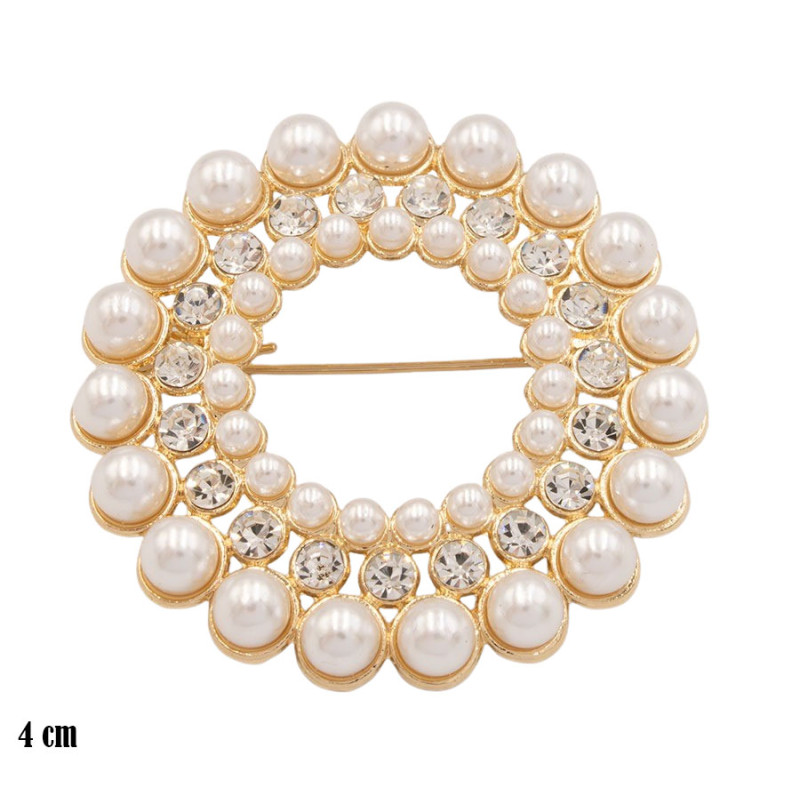 Broszka o średnicy 4 cm wyróżnia się klasyczną, okrągłą formą w złotym kolorze. Zewnętrzny kontur tworzą większe, jasne perłowe kulki, które nadają całości miękkości i elegancji. Wewnętrzną część wypełniają naprzemiennie mniejsze perełki oraz przezroczyste kamienie, budując efekt głębi i subtelnego połysku. Złota oprawa podkreśla jasną tonację detali i porządkuje całą kompozycję.