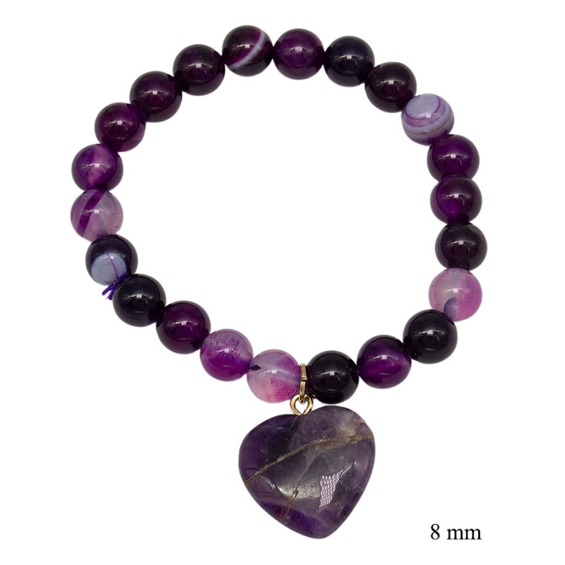 Bransoletka przyciąga uwagę intensywną paletą fioletów – od jasnych, lekko mlecznych tonów po głęboki, niemal czarny odcień śliwki. Okrągłe koraliki o średnicy 8 mm tworzą harmonijną kompozycję, w której subtelne przejścia barw nadają całości wyrazisty charakter. Centralnym punktem jest zawieszka w kształcie serca, utrzymana w tej samej kolorystyce, z naturalnymi przeżyłowaniami widocznymi na powierzchni.