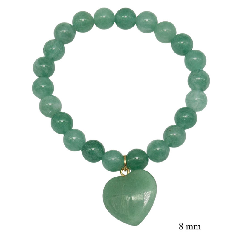 Bransoletka utrzymana jest w świeżej, zielonej tonacji o delikatnie zróżnicowanym nasyceniu. Gładkie, okrągłe koraliki o średnicy 8 mm tworzą regularny obwód, który dobrze układa się na nadgarstku. Centralnym elementem kompozycji jest zawieszka w kształcie serca, dopasowana kolorystycznie do całości. Widoczna struktura wewnątrz kamienia nadaje jej naturalny charakter, a złoty łącznik wprowadza subtelny kontrast.