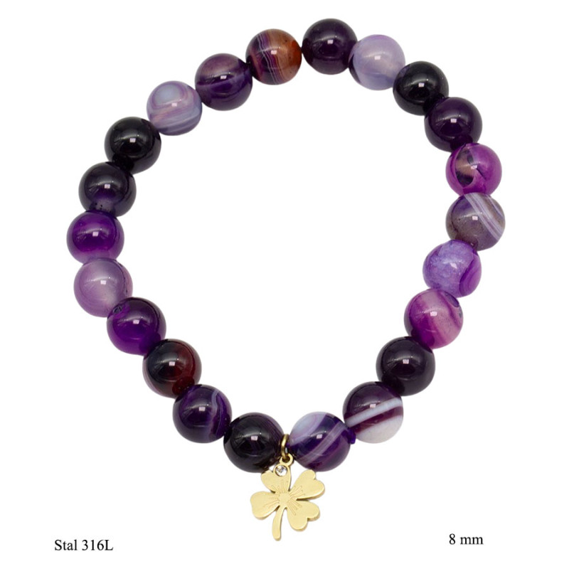 Bransoletka łączy w sobie różne odcienie fioletu – od jasnych, mlecznych tonów po głęboką śliwkę i niemal czarne akcenty. Okrągłe koraliki o średnicy 8 mm tworzą wyrazistą, ale harmonijną kompozycję. Widoczne przejścia barw i naturalne użyłowania nadają całości dynamiczny charakter. Centralnym detalem jest zawieszka w kształcie czterolistnej koniczyny wykonana ze stali 316L w złotym kolorze, która stanowi kontrastowy, dekoracyjny element.