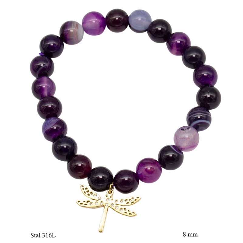 Bransoletka łączy różne odcienie fioletu – od jasnych, lawendowych tonów po ciemną śliwkę i niemal czarne akcenty. Okrągłe koraliki o średnicy 8 mm tworzą spójną kompozycję z widocznymi przejściami barw i naturalnymi smugami. Centralnym elementem jest zawieszka w kształcie ważki wykonana ze stali 316L w złotym kolorze. Ażurowa forma z drobnymi zdobieniami nadaje całości lekkości i wprowadza kontrast do intensywnej kolorystyki kamieni.