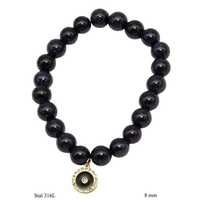 Bransoletka utrzymana jest w głębokiej, niemal czarnej tonacji z subtelnym, drobnym połyskiem widocznym na powierzchni koralików. Okrągłe elementy o średnicy 8 mm tworzą równą, wyważoną formę, która dobrze układa się na nadgarstku. Centralnym akcentem jest okrągła zawieszka wykonana ze stali 316L w złotym kolorze, ozdobiona drobnymi kamieniami wokół czarnego środka. Kontrast między ciemnymi koralikami a jasnym, metalowym detalem nadaje całości wyrazisty charakter.