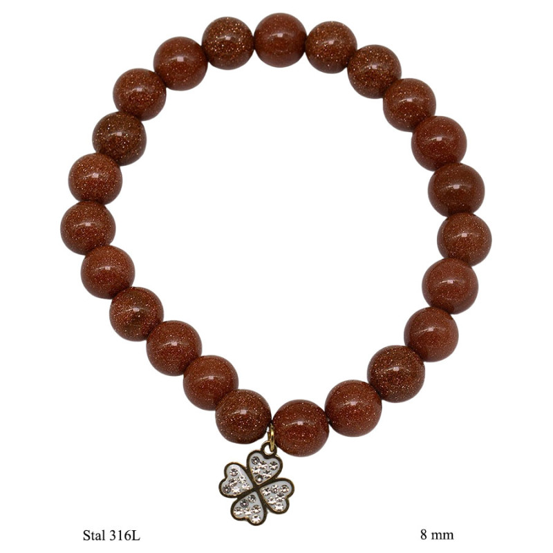 Bransoletka utrzymana jest w ciepłej, brązowej tonacji z drobnym, migoczącym połyskiem widocznym na powierzchni koralików. Okrągłe elementy o średnicy 8 mm tworzą zwartą, regularną formę, która dobrze układa się na nadgarstku. Centralnym detalem jest zawieszka w kształcie czterolistnej koniczyny wykonana ze stali 316L w złotym kolorze, ozdobiona drobnymi, jasnymi kamieniami. Zestawienie ciepłego brązu z metalicznym akcentem nadaje całości wyważony, dekoracyjny charakter.