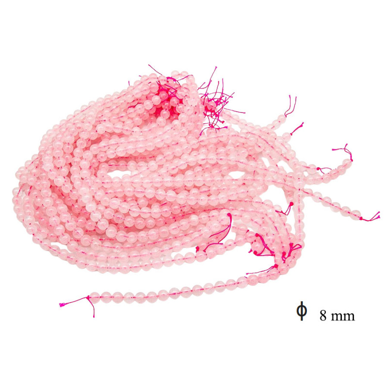 Sznur koralików w jasnym, różowym odcieniu wyróżnia się subtelną przejrzystością i lekkim połyskiem. Kulki o średnicy 8 mm mają gładką, równą powierzchnię, dzięki czemu tworzą harmonijną i uporządkowaną linię w projektach biżuteryjnych. Transparentny charakter sprawia, że światło delikatnie przenika przez koraliki, podkreślając ich pastelową barwę.