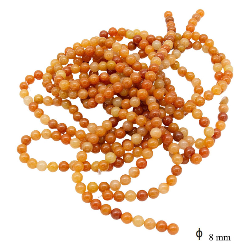 Sznur koralików o średnicy 8 mm prezentuje mieszankę ciepłych odcieni pomarańczy, miodu i jasnego bursztynu. Kulki mają gładką, lekko połyskującą powierzchnię, a subtelne przejścia kolorystyczne nadają im naturalny, zróżnicowany wygląd. Każdy element delikatnie odbija światło, dzięki czemu całość zyskuje głębię i wyrazistość. Równy, kulisty kształt ułatwia tworzenie symetrycznych projektów.
