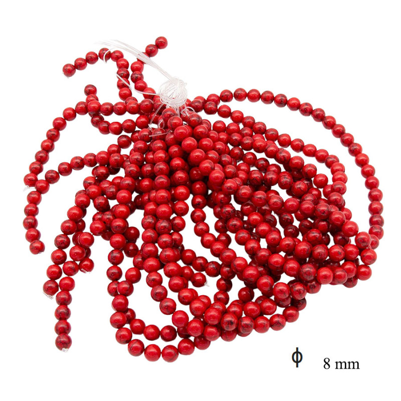 Sznur koralików o średnicy 8 mm wyróżnia się mocnym, nasyconym czerwonym kolorem z widocznymi ciemniejszymi żyłkami i nieregularnym rysunkiem. Kulki mają gładką, polerowaną powierzchnię, która delikatnie odbija światło i podkreśla głębię barwy. Powtarzalny, kulisty kształt pozwala tworzyć spójne, rytmiczne kompozycje w bransoletkach i naszyjnikach. Intensywny odcień przyciąga uwagę i stanowi wyrazisty akcent w gotowych projektach.