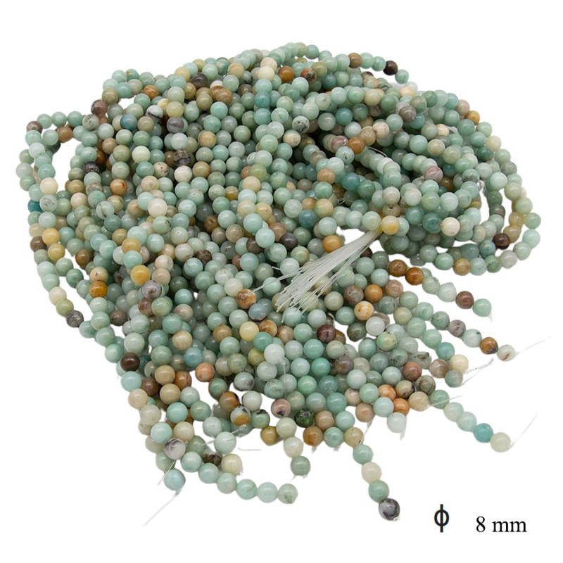Sznur koralików o średnicy 8 mm łączy delikatne odcienie mięty, jasnej zieleni, beżu oraz subtelnych brązowych akcentów. Każda kulka ma gładką, lekko połyskującą powierzchnię i widoczny, nieregularny rysunek, który nadaje całości naturalny charakter. Zróżnicowana kolorystyka sprawia, że projekty zyskują głębię i niepowtarzalny efekt wizualny, a powtarzalny, kulisty kształt pozwala tworzyć spójne kompozycje.