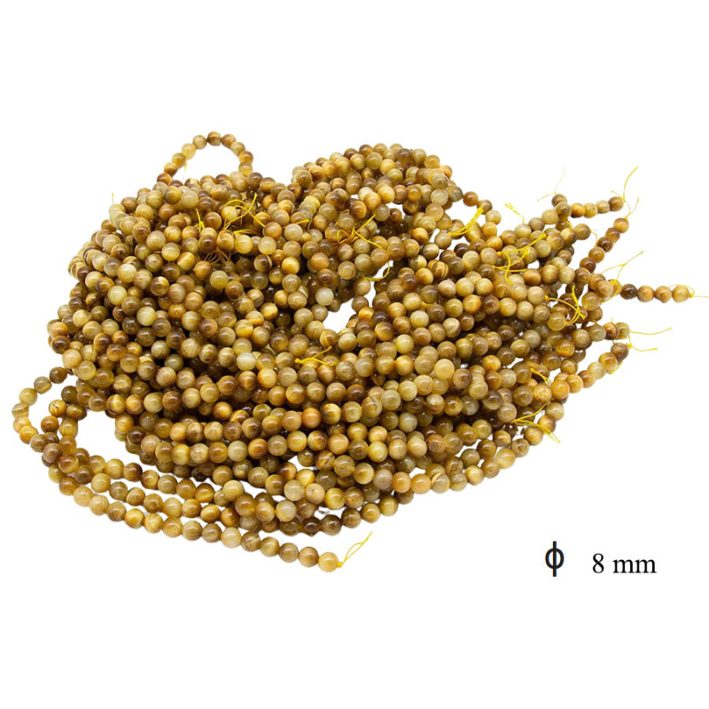 Sznur kulistych koralików o średnicy 8 mm utrzymany jest w ciepłej, miodowo-beżowej kolorystyce z widocznym, naturalnym rysunkiem wewnątrz każdej kulki. Odcienie przechodzą od jasnego karmelu po głębszy brąz, tworząc spójną, harmonijną całość. Gładka, zaokrąglona forma oraz delikatny połysk sprawiają, że koraliki dobrze odbijają światło i nadają projektom przyjemnej miękkości wizualnej.