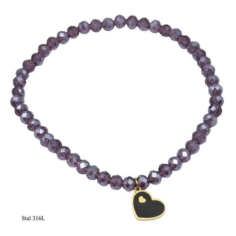 Bransoletka z drobnych, fasetowanych koralików w odcieniu przygaszonego fioletu przyciąga subtelną grą światła. Szlifowane powierzchnie odbijają refleksy, dzięki czemu całość prezentuje się lekko i elegancko. Centralnym punktem kompozycji jest zawieszka w kształcie serca w złotym kolorze, z ciemnym wypełnieniem i małym wyciętym serduszkiem. Kontrast między połyskującymi koralikami a wyrazistą zawieszką nadaje bransoletce nowoczesny charakter.