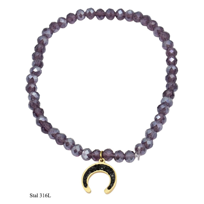 Bransoletka z drobnych, fasetowanych koralików w odcieniu zgaszonego fioletu tworzy spójną, elegancką kompozycję. Szlifowane powierzchnie odbijają światło, nadając całości delikatny blask i lekkość. Centralnym elementem jest zawieszka w kształcie podkowy w złotym kolorze, ozdobiona czarnymi kamieniami, które podkreślają kontrast i dodają wyrazistości. Zestawienie chłodnego fioletu z ciepłym złotem przyciąga uwagę i nadaje bransoletce nowoczesny charakter.