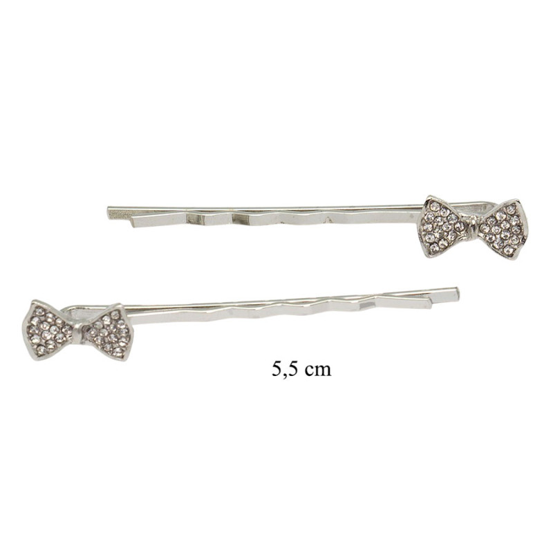 Zestaw wsuwek do włosów w srebrnym kolorze przyciąga uwagę delikatnym detalem w kształcie kokardki. Ozdobna część została wypełniona drobnymi, błyszczącymi kamieniami, które subtelnie odbijają światło i nadają całości elegancki charakter. Prosta forma spinki kontrastuje z dekoracyjnym wykończeniem, tworząc harmonijną i lekką kompozycję. Długość wsuwki wynosi 5,5 cm, co pozwala na stabilne upięcie pasm włosów bez dominowania całej fryzury.