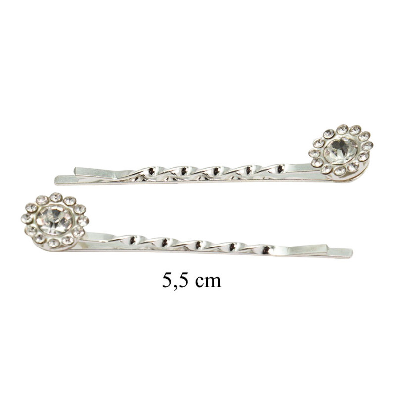 Zestaw wsuwek do włosów w srebrnym kolorze łączy klasyczną formę z wyrazistą ozdobą. Każda spinka zakończona jest okrągłym elementem z centralnym, większym kamieniem otoczonym drobnymi kryształkami, które tworzą efekt delikatnej ramki. Skręcona, subtelnie falowana konstrukcja wsuwki nadaje całości lekkości i dekoracyjnego charakteru. Długość 5,5 cm pozwala na wygodne i stabilne upięcie wybranych pasm włosów.