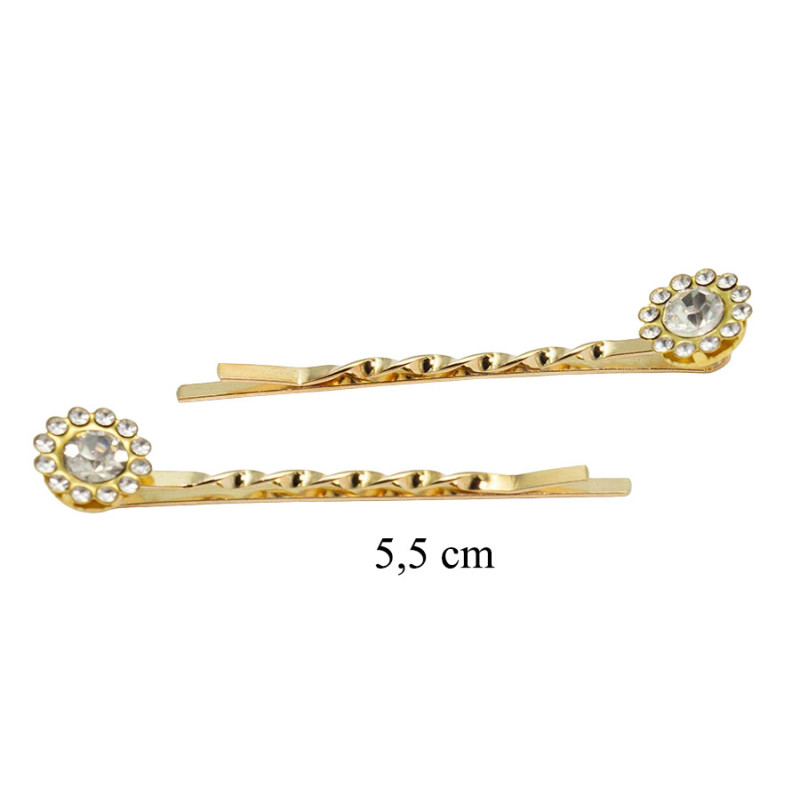 Zestaw wsuwek do włosów w złotym kolorze łączy elegancką linię z wyrazistym detalem. Każda spinka zakończona jest okrągłą ozdobą z centralnym, większym kamieniem otoczonym drobnymi kryształkami, które tworzą efekt świetlistej rozety. Falowana, dekoracyjnie wyprofilowana konstrukcja wsuwki nadaje całości subtelnej dynamiki. Długość 5,5 cm zapewnia wygodne i stabilne podpięcie pasm włosów bez nadmiernego obciążenia fryzury.