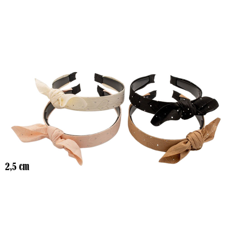 Zestaw opasek do włosów o szerokości 2,5 cm przyciąga uwagę miękką formą i dekoracyjnym wiązaniem z przodu. Każdy model wykończono materiałem w stonowanej kolorystyce – od jasnego beżu, przez pudrowy odcień, po czerń i ciepły brąz. Powierzchnię zdobią drobne, błyszczące elementy, które delikatnie odbijają światło i nadają całości subtelny akcent. Konstrukcja opaski zapewnia stabilne ułożenie na głowie, a wiązany detal wprowadza lekkość i kobiecy charakter.