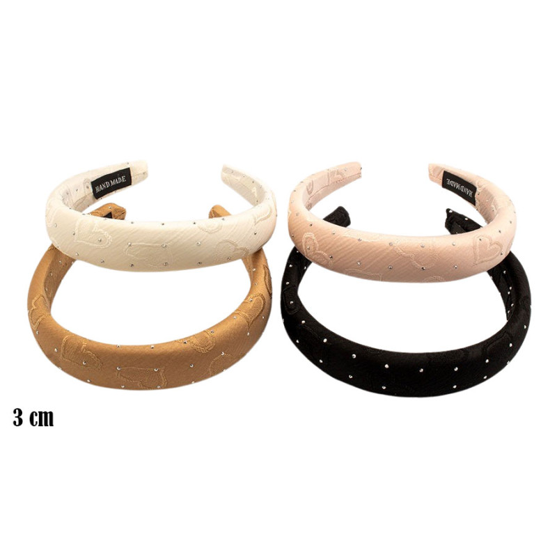 Opaski do włosów o szerokości 3 cm wyróżniają się miękką, lekko wypukłą formą i delikatnym pikowanym wzorem. Na powierzchni widoczne są drobne, błyszczące punkty oraz subtelne motywy serc, które nadają całości dekoracyjny, ale nienachalny charakter. W kolekcji znajdują się cztery stonowane kolory: jasny krem, pudrowy róż, ciepły karmel oraz klasyczna czerń. Wnętrze wykończono w sposób zapewniający stabilne utrzymanie na włosach.
