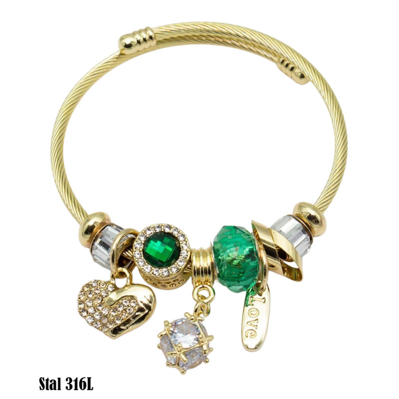 Bransoletka o sztywnej, skręcanej konstrukcji łączy złotą bazę z wyrazistym, zielonym akcentem. Otwarta forma z dekoracyjnymi zakończeniami tworzy elegancką ramę dla ozdobnych koralików. W centralnej części znajduje się okrągły detal z intensywnie zielonym kamieniem, otoczony drobnymi kryształkami. Obok umieszczono większy, fasetowany element w głębokim odcieniu zieleni oraz transparentne koraliki o szlifowanej powierzchni. Całość uzupełniają zawieszki: serce wysadzane drobnymi kryształkami, przestrzenna kostka z jasnym kamieniem oraz podłużna blaszka z napisem „Love”.