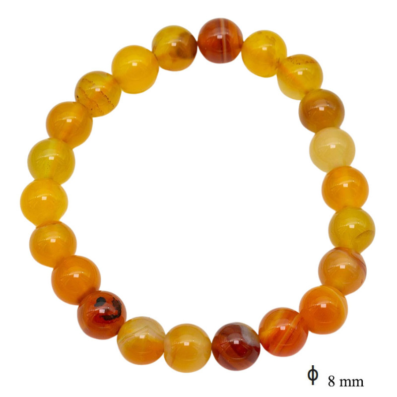 Bransoletka wykonana z gładkich, polerowanych kulek w ciepłych odcieniach żółci, bursztynu i karmelu. Kamienie charakteryzują się subtelnym użyleniem oraz naturalnymi przejściami barw – od jasnego miodu po głęboką, nasyconą pomarańcz. Dzięki temu każda sztuka posiada niepowtarzalny układ wzorów.