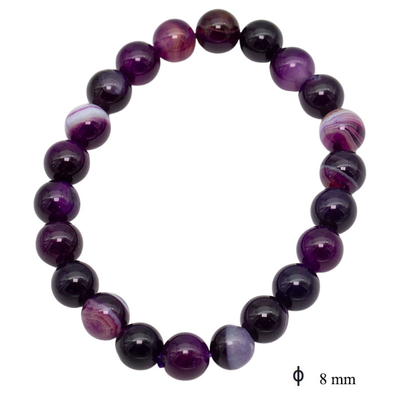 Bransoletka z kulek o średnicy 8 mm przyciąga uwagę intensywną, nasyconą kolorystyką. Odcienie śliwkowe, bakłażanowe i ciemny fiolet przeplatają się z jaśniejszymi pasmami i subtelnym użyleniem, widocznym na wybranych kulkach. Gładka, polerowana powierzchnia odbija światło, podkreślając głębię barw. Całość tworzy spójną, elastyczną formę, która dobrze układa się na nadgarstku i zachowuje klasyczny, okrągły kształt.