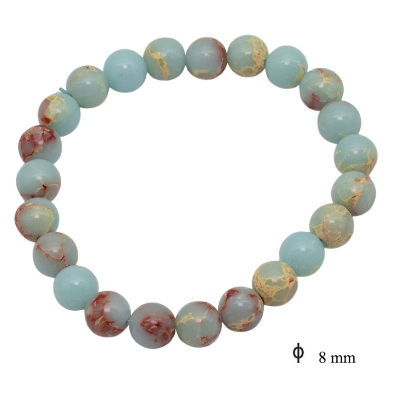 Model z kulek o średnicy 8 mm wyróżnia się delikatną, błękitno-miętową kolorystyką przełamaną nieregularnym rysunkiem w odcieniach beżu, złamanej żółci i ceglanej czerwieni. Każda kulka ma subtelne, marmurkowe użylenie, dzięki czemu bransoletka nie wygląda jednolicie. Polerowana powierzchnia nadaje jej lekki połysk i podkreśla naturalny charakter wzoru. Elastyczna forma dobrze dopasowuje się do nadgarstka i zachowuje regularny, okrągły kształt.