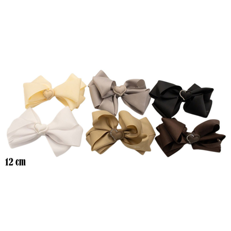 Elegancka kokarda do włosów o szerokości 12 cm, ozdobiona dekoracyjnym serduszkiem umieszczonym w centralnej części. Subtelny detal z delikatnym obramowaniem nadaje całości stylowego i kobiecego charakteru.