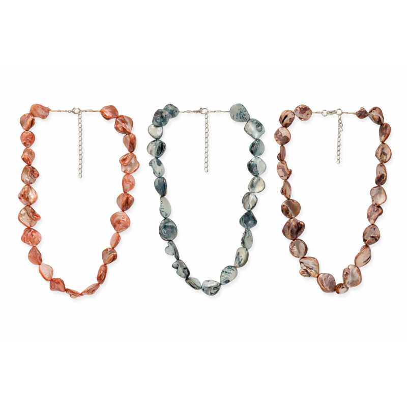 Efektowny naszyjnik wykonany z nieregularnych, muszelek o organicznych kształtach. Każdy element wyróżnia się unikalną strukturą, delikatnym połyskiem oraz subtelnymi przejściami kolorystycznymi, co sprawia, że biżuteria ma wyjątkowy, niepowtarzalny charakter.